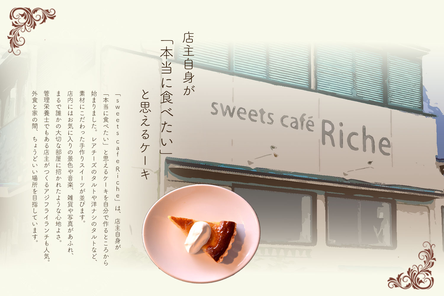 JR須磨駅より徒歩2分のところにある、店主の”好き”が詰まった手作りケーキと心地よい空間のカフェ「sweets cafe Riche」